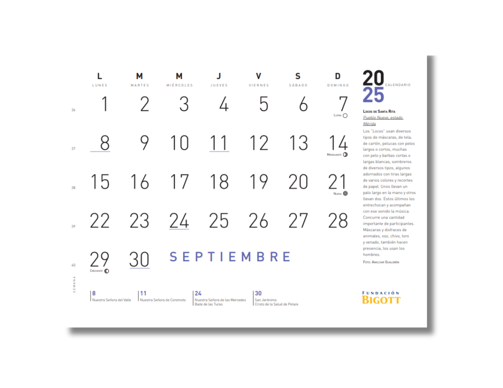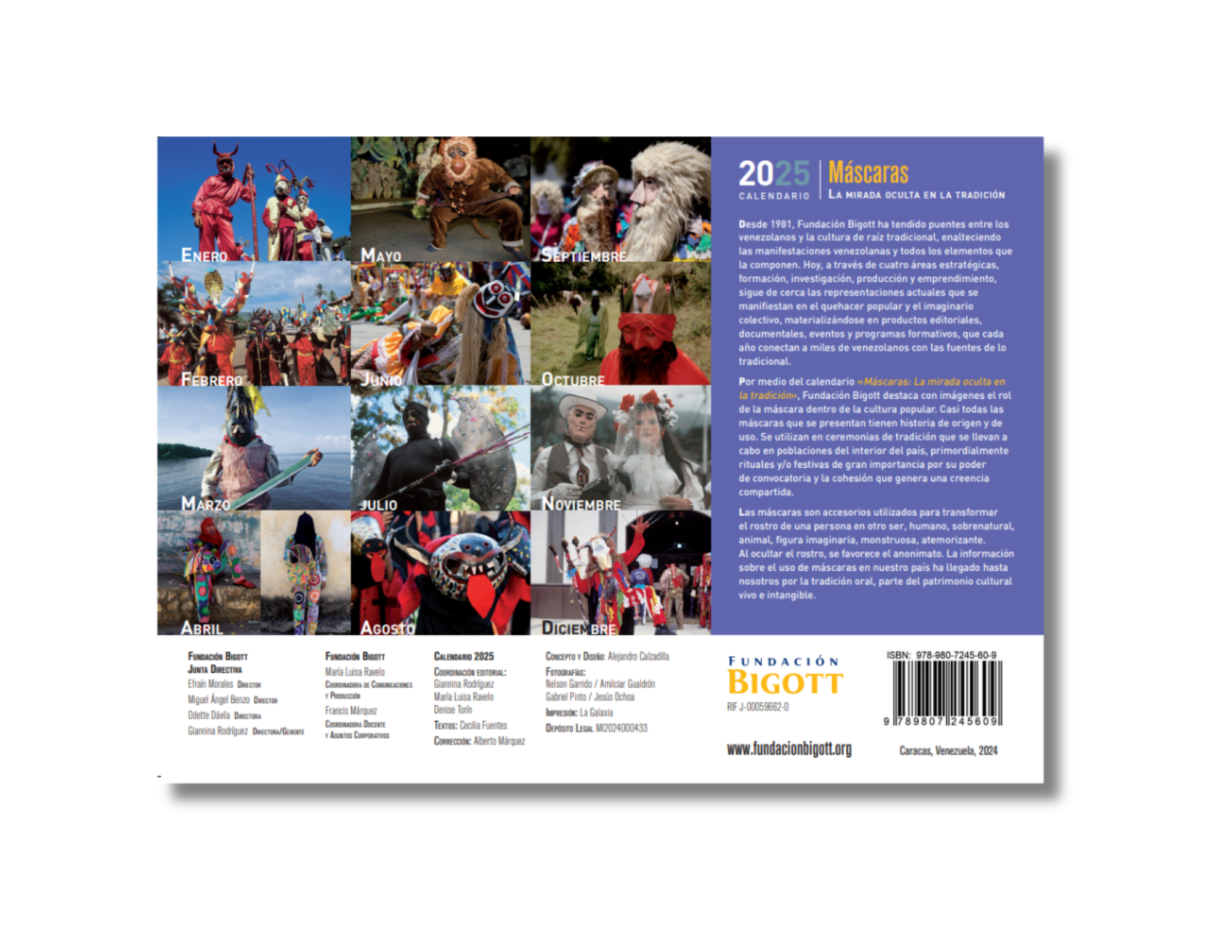 Continuando con nuestra misión de valorización y divulgación de las tradiciones populares de nuestro país, desde Fundación Bigott dedicamos el calendario 2025 al fascinante mundo de las máscaras que dan vida a las diversas celebraciones venezolanas. Se trata de un homenaje que permite descubrir las historias de origen y de uso detrás de estas máscaras, empleadas por poblaciones del interior del país en ceremonias festivas y rituales. Asimismo, se busca resaltar la gran importancia que envuelve estas expresiones culturales en los lugares donde se celebran, debido a su poder de convocatoria y la cohesión que generan estas creencias compartidas.
